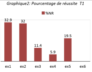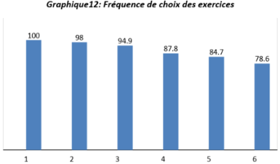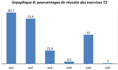Le meilleur pourcentage de réussite est enregistré à l'exercice1 ; il n'atteint même pas 33%, il est suivi par l'exercice 2 avec 32%. Ce qui prouve que les résultats de ce test sont faibles dans l'ensemble.
