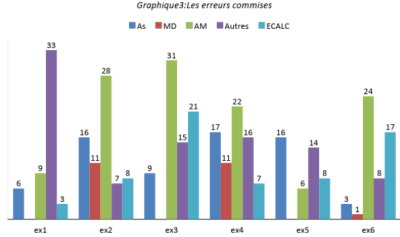 Les erreurs les plus fréquentes sont les erreurs relevant d'une confusion entre structures additives (addition/soustraction) et structures multiplicatives (multiplication/division) comme le montre le fort pourcentage d'erreurs codé AM aux exercices 2 à 6. Notons aussi un fort pourcentage d'erreurs codées « autres » et codées erreurs de calculs (ECALC) et enfin des erreurs internes à la structure additive : confusion entre l'addition et la soustraction. Les nombreuses erreurs peuvent aussi expliquer la faiblesse des résultats.