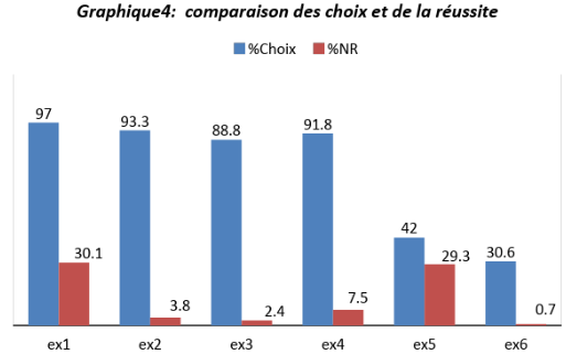 Le tableau ci-dessous présente les énoncés des exercices, leur type ainsi que le pourcentage d'élèves ayant réussi chaque exercice. Le graphique 4 présente les pourcentages d'élèves ayant choisi chaque type d'exercices et de bonnes réponses.