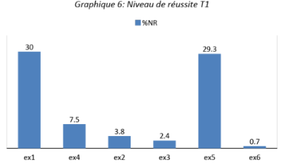 Plus de la moitié des élèves ont échoué aux exercices 3, 4, 5 et 6. Les exercices les moins réussis sont les exercices 5 et 4.