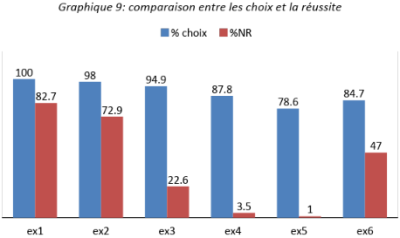 Les deux graphiques montrent que le taux réussite d'un exercice ne dépend pas du pourcentage d'élèves l'ayant choisi. Il semble donc que les élèves éprouvent des difficultés à reconnaître les exercices qu'ils sont capables de traiter.