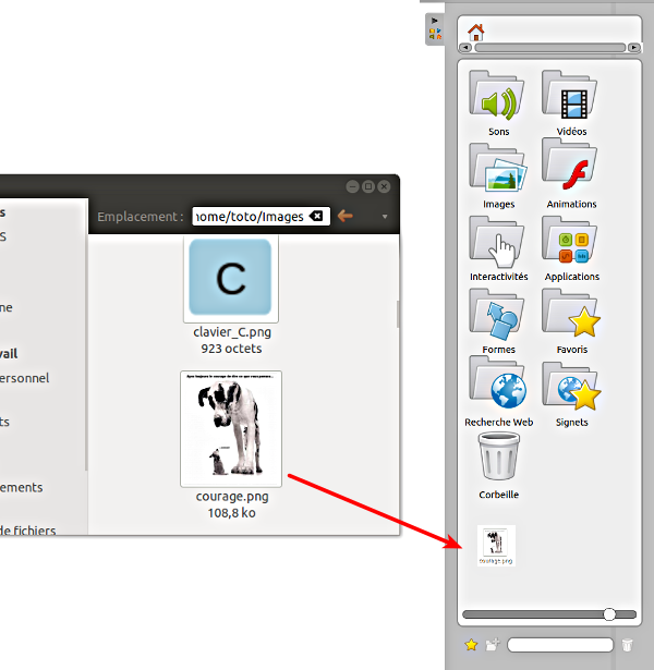 Il vous suffit de glisser-déposer les fichiers voulus sur la barre de la bibliothèque, Sankoré triera automatiquement le type de fichier ajouté (image, vidéo ou son) et le placera à la racine de la bibliothèque correspondante.
